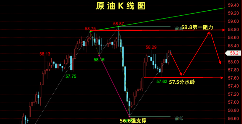 多单:激进57.5±0.2区间,稳健56.6±0.2区间 ,止损‌:各0.6左右,目标位‌:58.8附近!